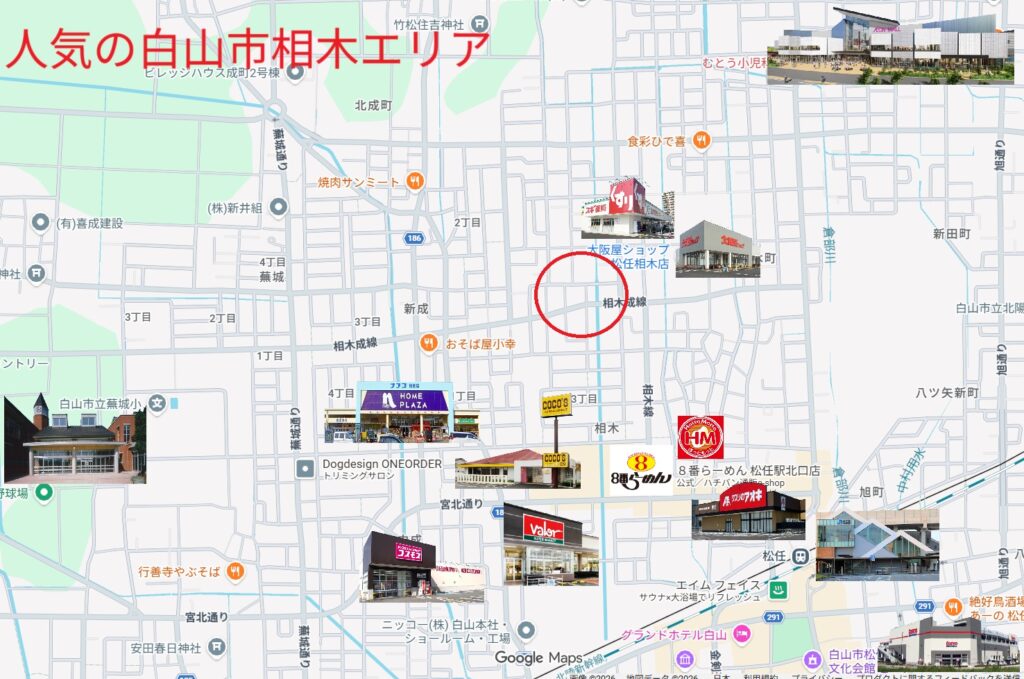 ここは白山イオンのすぐそばでコメリやマクドナルドも近くにあります。