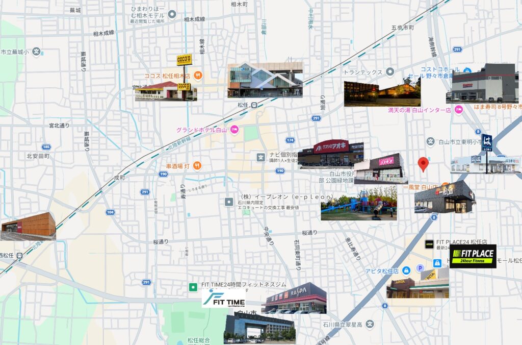 次に、金沢のベッドタウンともいえる白山市です。松任駅や西松任駅があり、大型商業施設、交通アクセスいろいろと充実しています。
