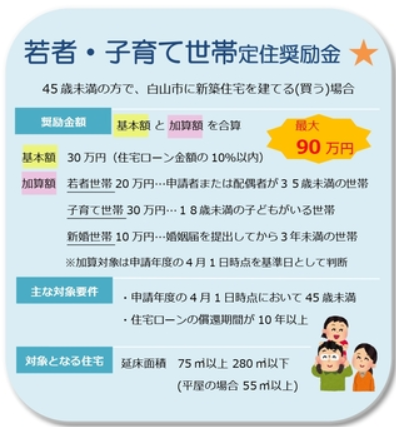 また、白山市では定住促進奨励金で最大90万円の補助金があります。