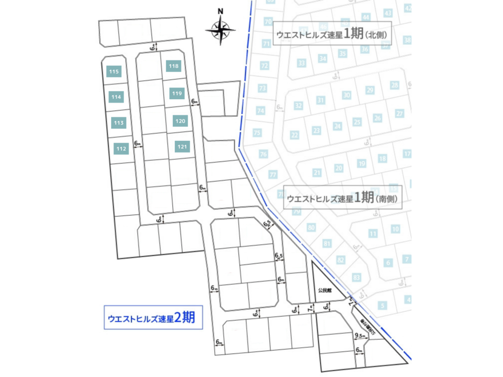 | ●区画面積 | 201.85㎡(112) 201.92㎡(113) 201.98㎡(114) 205.98㎡(115角地) 207.44㎡(118角地) 204.4㎡(119) 209.72㎡(120) 212.86㎡(121) |