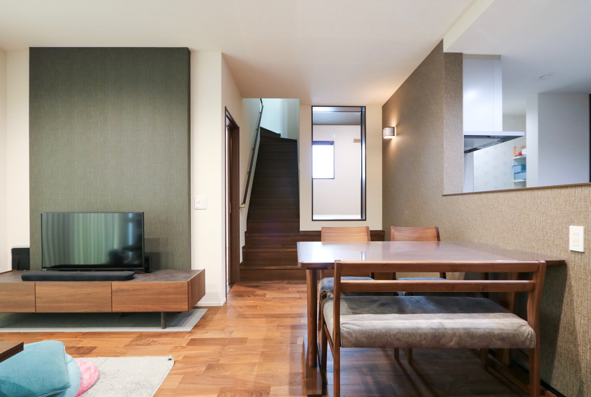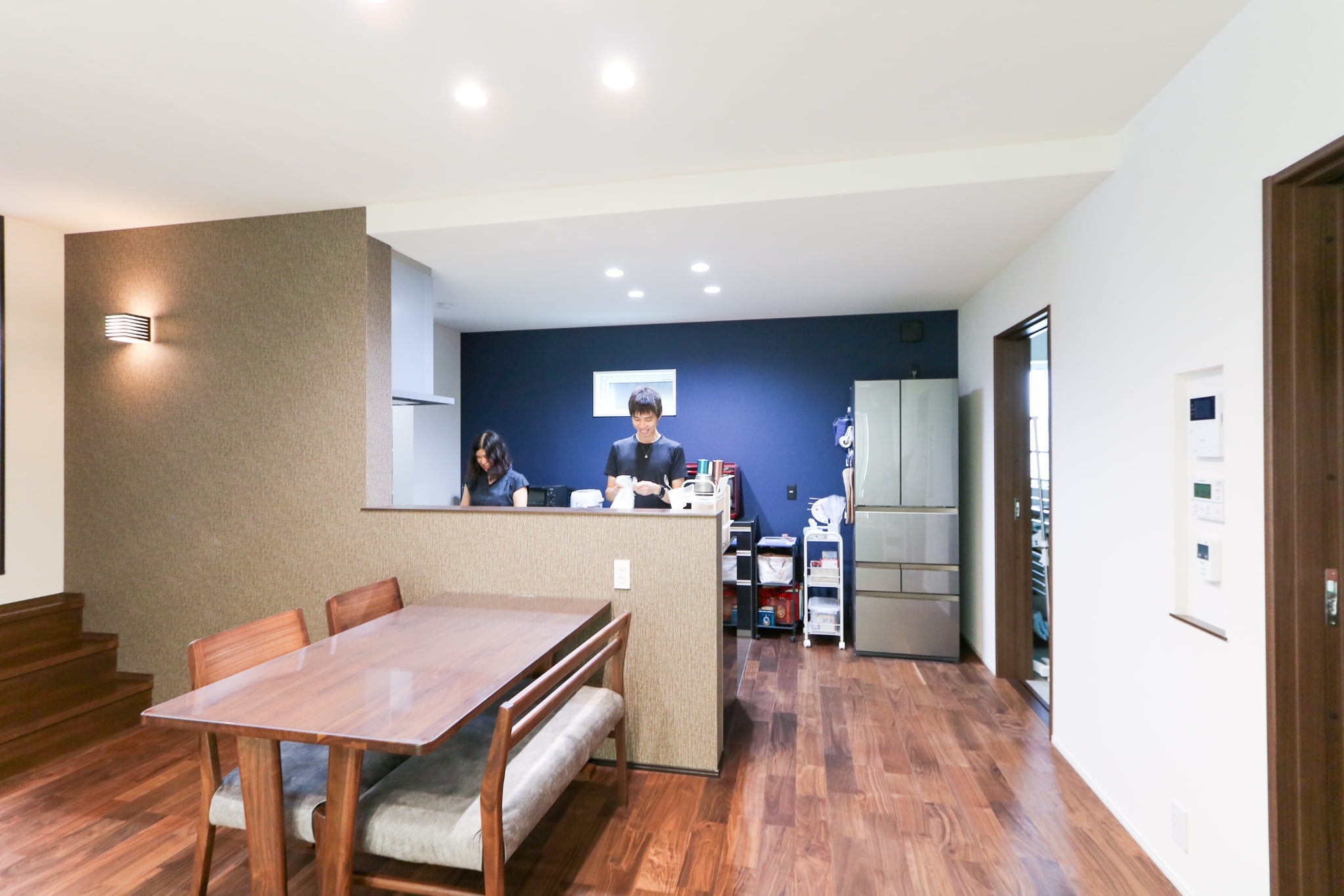 大迫力のスクリーンと臨場感あふれるサウンドで映画を見ると、好きな映画がより一層楽しめるます。奥様 : 床や建具の色を暗めにして落ち着いたモダンな雰囲気にしたことです。特にキッチンは収納スペースもたくさんあり、使い勝手も良くとても気に入っています。
