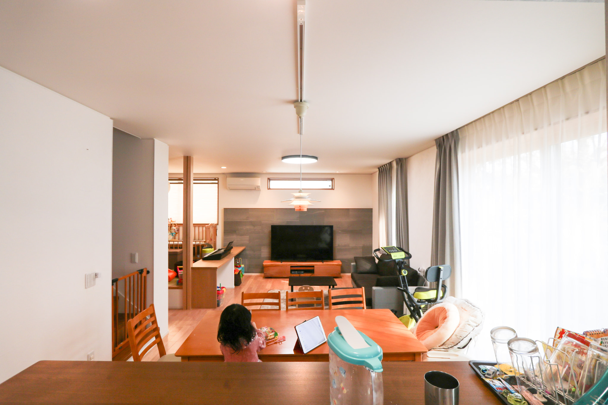 ご主人 : 「断熱・省エネ性能」「耐震性能」にこだわりたいと思っていました。特に断熱材の厚さや換気方法はこちらのこだわりに合わせてカスタムしました。また、家族で2階の部屋の壁を塗ったことも大変でしたがいい思い出です。TV台も無垢材を使用し自分で造りました。