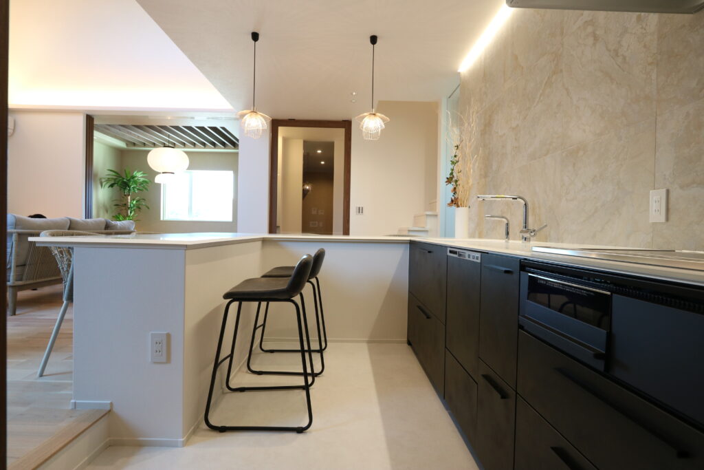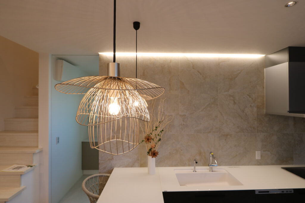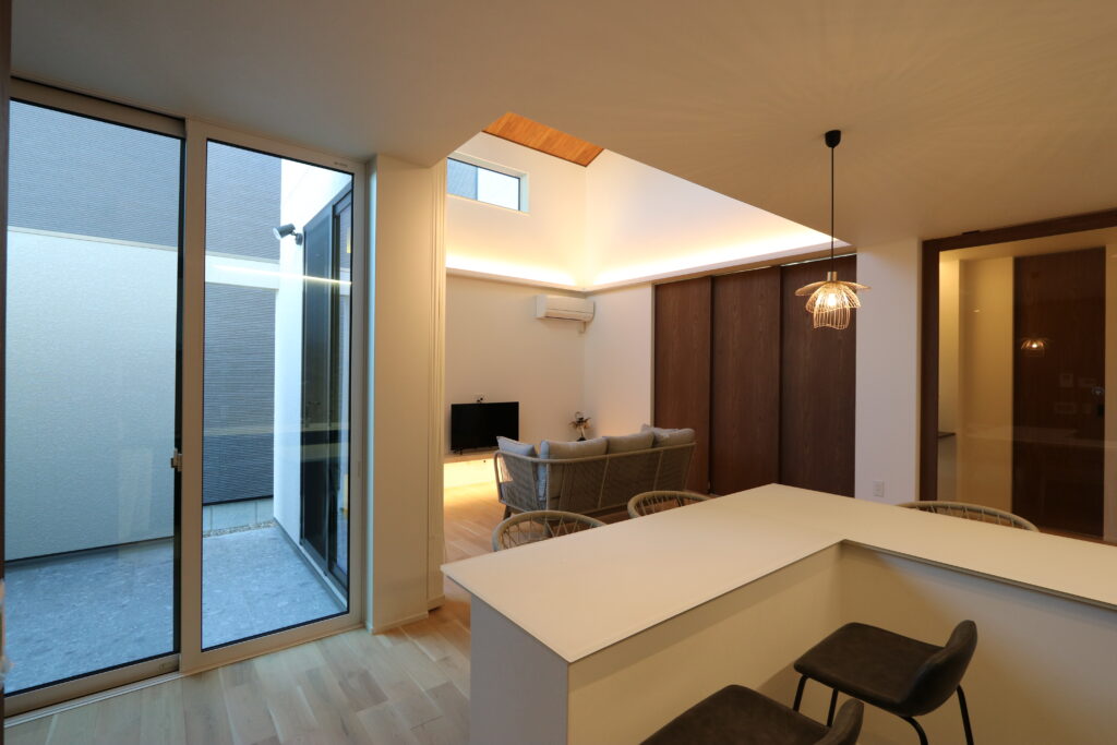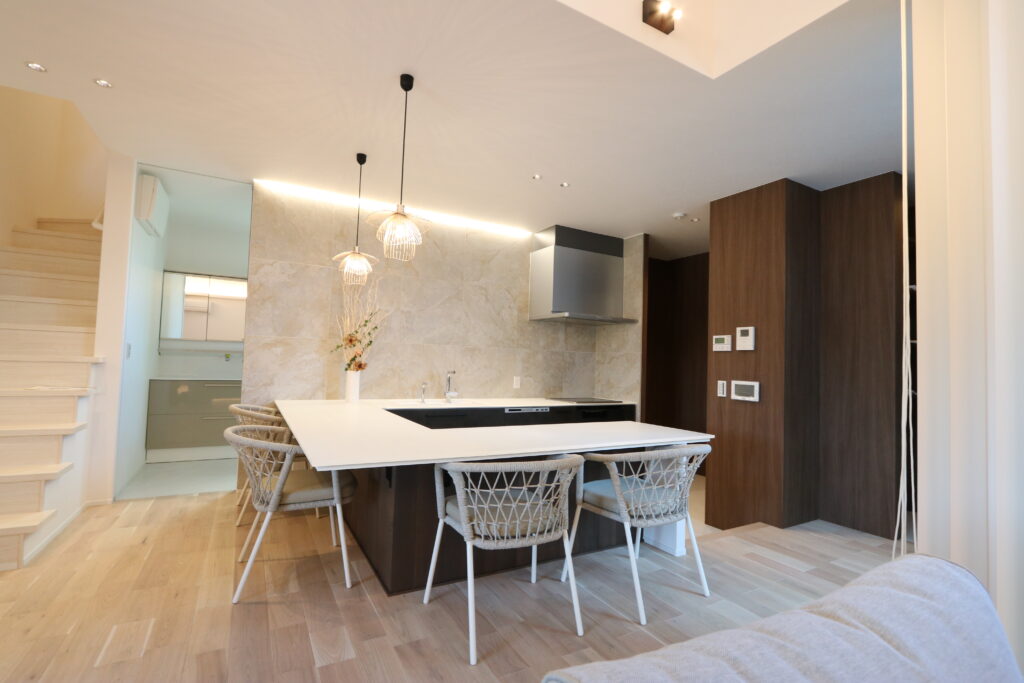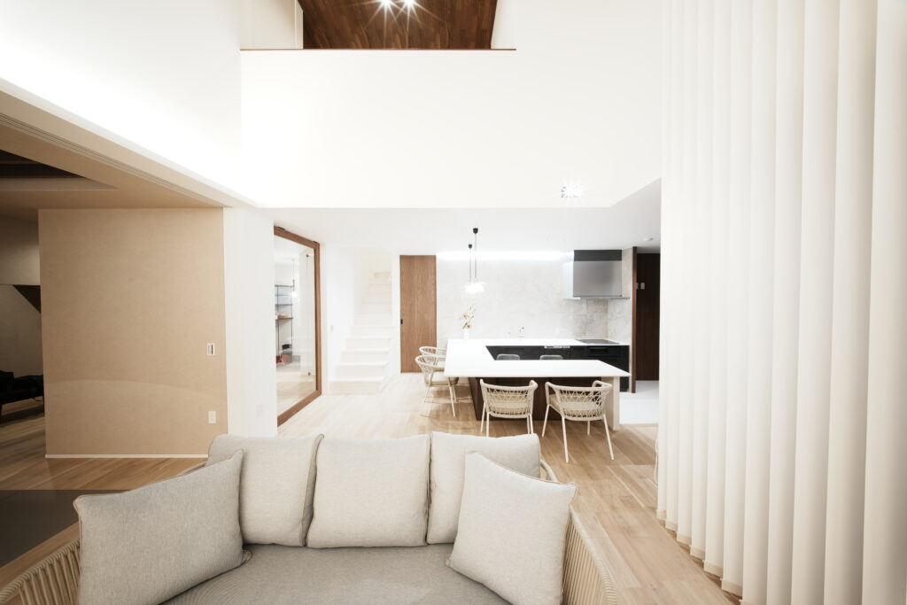 ラグジュアリーホテルのような上質な空間を、日常の暮らしに。吹き抜けのリビング&ダイニングキッチンには、大きな窓から自然光が降り注ぎ、明るく開放的な空間を演出します。特別感のあるダイニングカウンターと開放的なテラスが、暮らしに心地よい余白をもたらします。