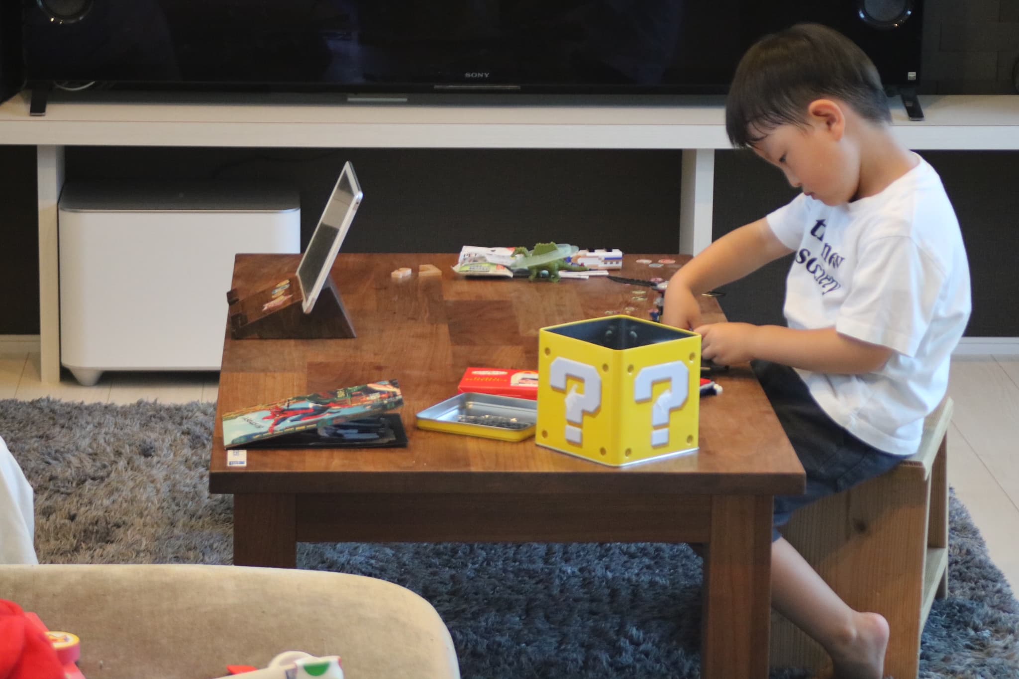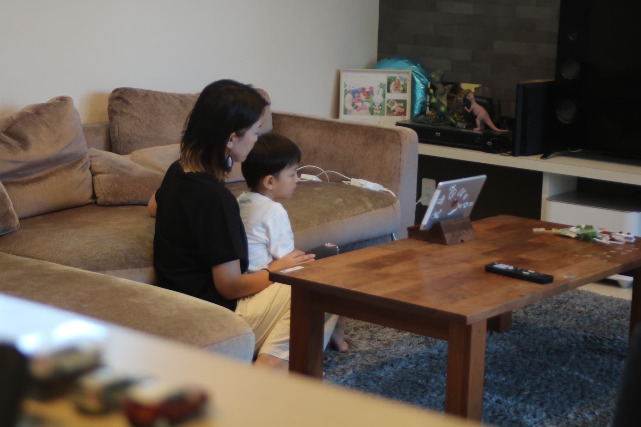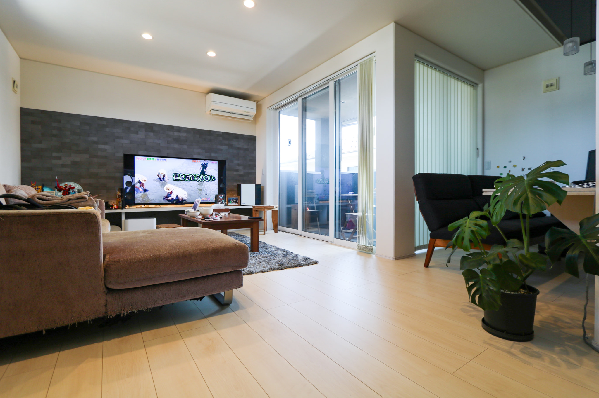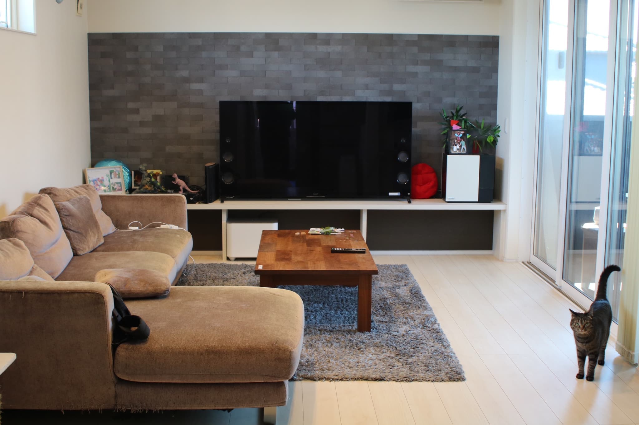 奥様 : 2階のLDKが1番お気に入りです。テレビを置く壁をエコカラット、間接照明でモダンな雰囲気。AV機器を配置出来るよう造作棚をつけていただきました。日当たりの良い南側に広めのベランダを作ってもらい、テーブルセットを置きました。カーテンを開けて眺めるのが好きです。